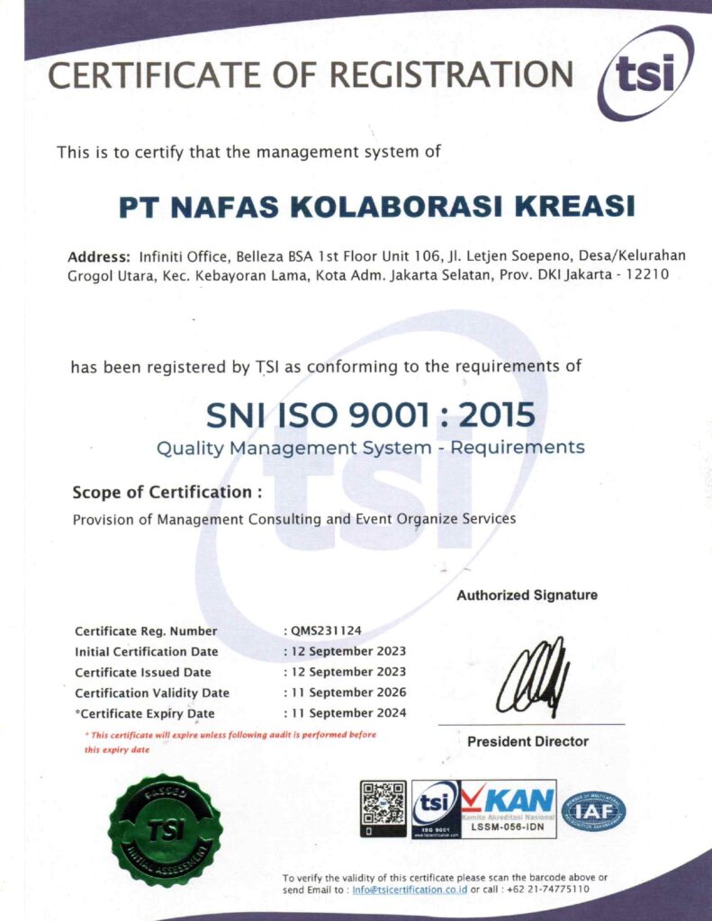 PT Nafas Kolaborasi Kreasi berkomitmen menjadi mitra strategis dengan berusaha memberikan kepuasan dan kenyamanan bagi customer.